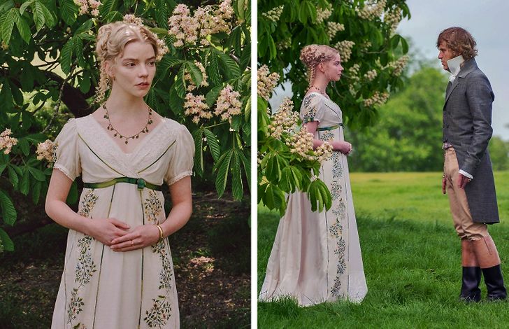 W porównaniu z innymi strojami bohaterki, ten jest bardzo prosty, ale zapadający w pamięć przez swoją niezwykłą delikatność. Kwiatowy ornament doskonale wpasowuje się w krajobraz podczas sceny, w której Emma dowiaduje się o uczuciach George’a Knightleya. Ta wizualna harmonia nie jest jednak pomysłem reżysera a decyzją projektantki kostiumów Alexandry Byrne. Chciała ona uzyskać wizualny efekt, dzięki któremu Emma w niektórych scenach harmonijnie wkomponowuje się w swoje otoczenie, a w innych pozostaje z nim w sprzeczności.