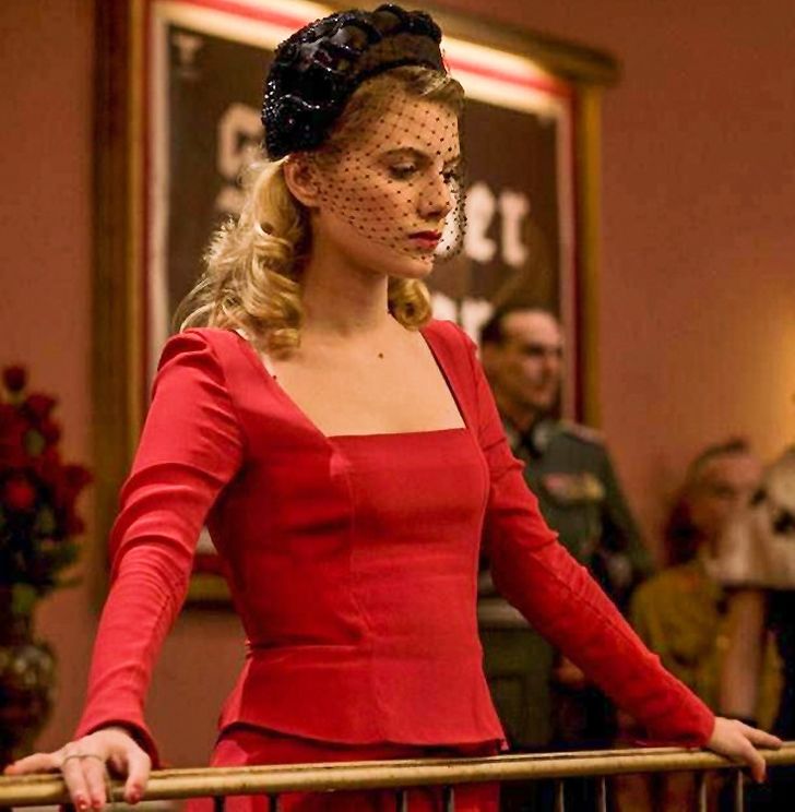 Ta jaskrawa, szkarłatna suknia w stylu lat 40., stworzona przez projektantkę kostiumów Annę B. Sheppard symbolizuje pragnienie zemsty noszącej ją bohaterki.  Szminka i lakier do paznokci w tym samym kolorze jeszcze bardziej podkreśla determinację kobiety i zapowiada dramatyczny finał sceny w kinie, gdzie zebrali się złoczyńcy odpowiedzialni za zamordowanie jej rodziny.