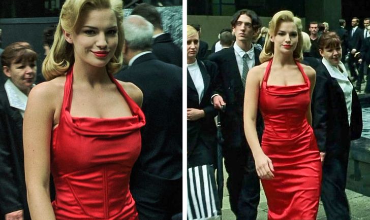 „Słuchałeś mnie, Neo? Czy gapiłeś się na kobietę w czerwonej sukni?” – pyta głównego bohatera Morfeusz. Oszałamiająca czerwona suknia momentalnie przyciąga wzrok na tle czarnych garniturów. Ten kontrast działa zarówno na widzów, jak i bohaterów filmu. Szybko staje się jasne, że kobieta w czerwieni to tak naprawdę komputerowa symulacja, element programu szkoleniowego agentów mający na celu odwrócenie uwagi. Chociaż sama postać kobiety jest nieszkodliwa, jej obecność rozprasza uczestników szkolenia, wywołując u nich znany w psychologii „efekt czerwonej sukienki” tym samym odciągając ich od prawdziwego zagrożenia.