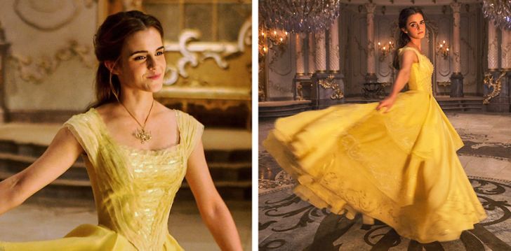 Żółta suknia balowa z tej ekranizacji „Pięknej i Bestii” była wzorowana na animowanej adaptacji Disneya. Emma Watson chciała jednak, aby jej Bellę przedstawiono jako nowoczesną, silną i odważną bohaterkę, do której nie do końca pasował strój z bajkowego pierwowzoru. Projektantka kostiumów Jacqueline Durran starała się więc znaleźć równowagę między nową interpretacją głównej bohaterki a nawiązaniem do kinowego klasyka.
