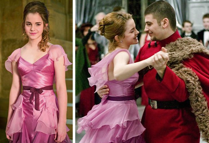 Delikatna różowa sukienka z falbankami to pierwsza prawdziwie kobieca stylizacja Hermiony w filmach o Harrym Potterze. Dzięki niej oraz nowej fryzurze Harry i Ron wreszcie dostrzegają, że Hermiona jest nie tylko wspaniałą przyjaciółką i świetną uczennicą, ale także bardzo atrakcyjną dziewczyną.
