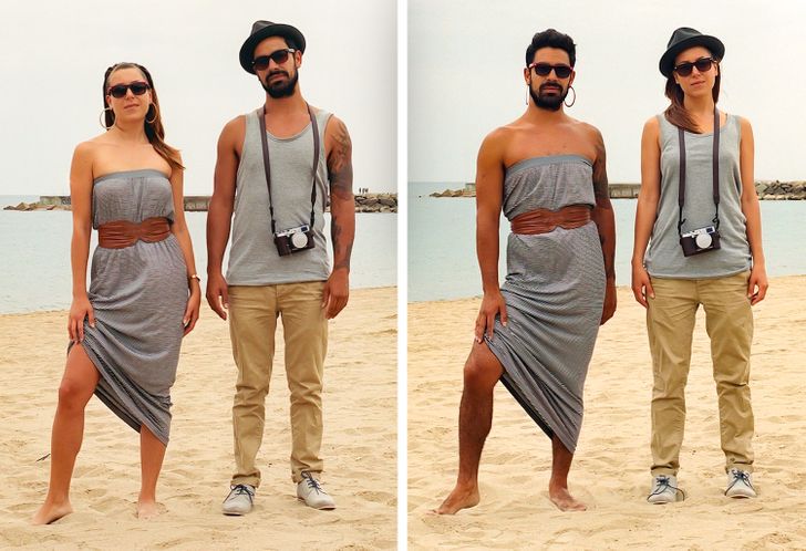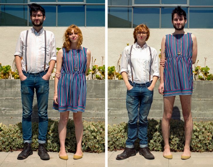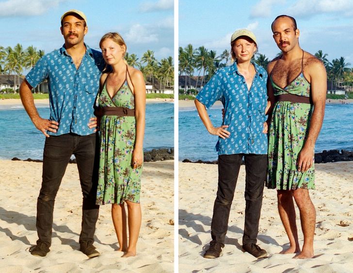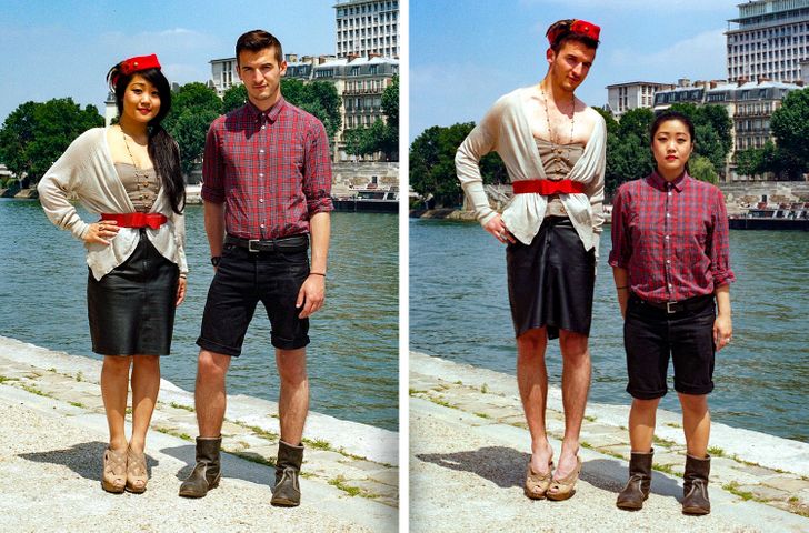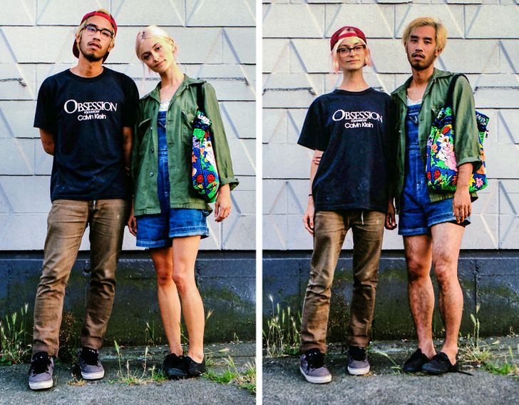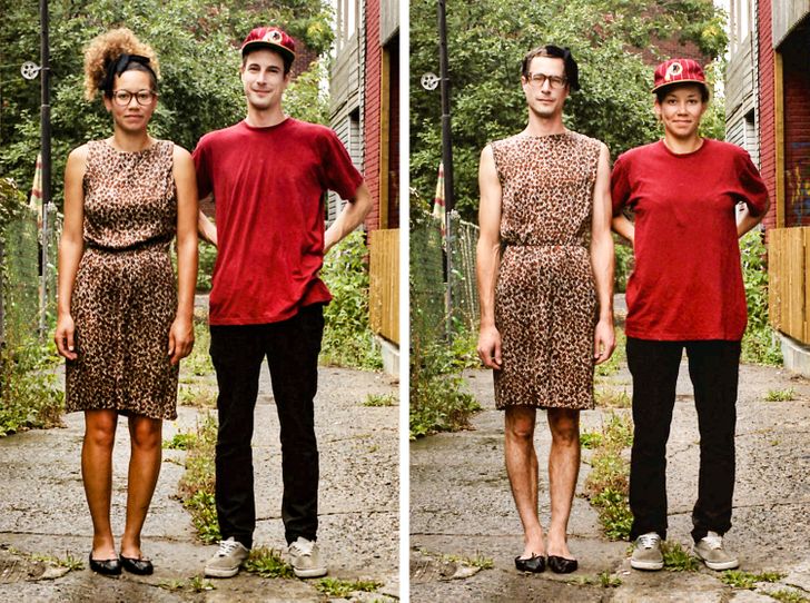 Umiejętność wchodzenia w czyjeś buty (w sensie przenośnym) jest niezwykle ważna, jednak pewna utalentowana fotografka nie poprzestaje tylko na obuwiu. Hana Pesut wpadła na pomysł ciekawej sesji zdjęciowej podczas biwaku, kiedy to zobaczyła dwóch swoich przyjaciół w bardzo różnych strojach. Jeden z nich miał na sobie wyraziste połączenie lamparcich cętek i jedwabnej apaszki, zaś drugi włożył monochromatyczny czarny T-shirt i dżinsy. Pomyślała: “Co by było, gdyby te ubrania zmieniły swoich właścicieli?” Ta seria zdjęć jest czymś więcej niż tylko zestawieniem ciekawych obrazków – zmusza nas bowiem do zastanowienia się nad normami płci i wywołuje dyskusje na temat ich prezentacji w dzisiejszym społeczeństwie.