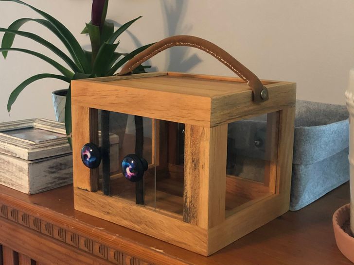 „Moja córka poprosiła o 'skrzynkę na robaki’. Mieliśmy kilka starych drewnianych krzeseł. Przerobiłem je i po raz pierwszy pracowałem ze skórą, żeby zrobić uchwyt. Nie jest idealnie, ale moje dziecko jest zachwycone.”