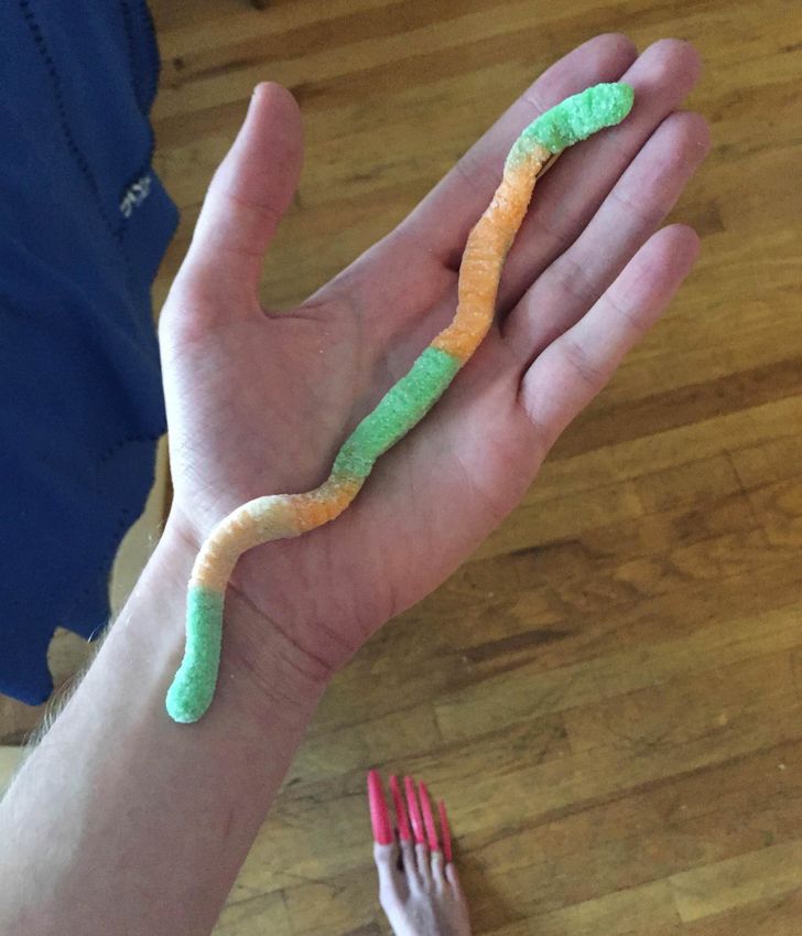 Spójrzcie, jak długi jest ten żelkowy robak! To jednak nie jest najważniejsze na tym zdjęciu…