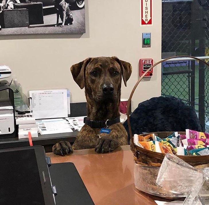 „To jest Derek. Jest nocnym kierownikiem w hotelu dla psów i chciałby dostać trochę smakołyków.”