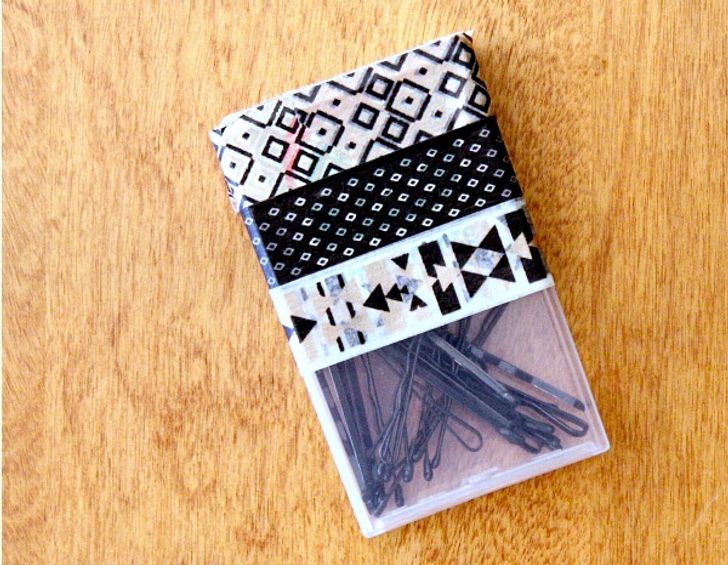Pozbądź się odstających włosów w każdej sytuacji, zawsze mając przy sobie pudełko wsuwek. Wystarczy, że zastąpisz oryginalną etykietę wzorzystą taśmą… i voila!
