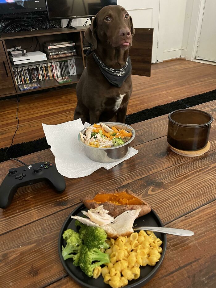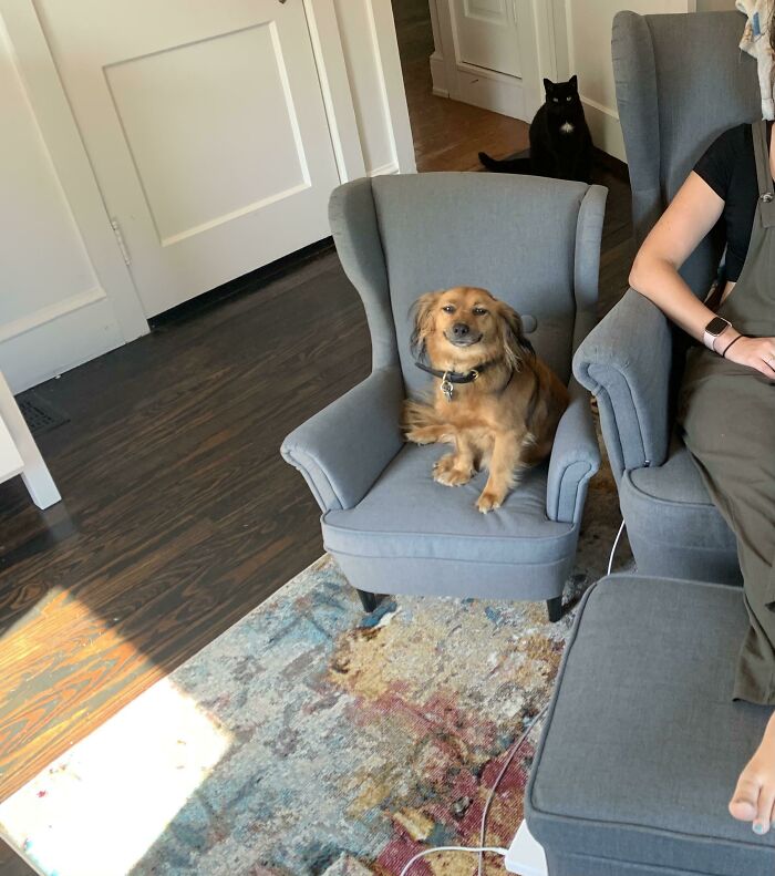 20. „Kupiłam mojemu szczeniakowi pasujące krzesło, żeby przestał kraść moje. Nie trzeba dodawać, że jest bardzo zadowolony.”