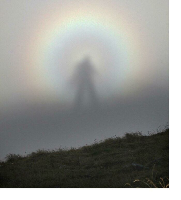 6. Rzadkie zjawisko optyczne, „Widmo Brockenu”, który występuje, gdy człowiek stoi na wyższej wysokości w górach i widzi swój cień rzucany na chmurę na niższej wysokości.