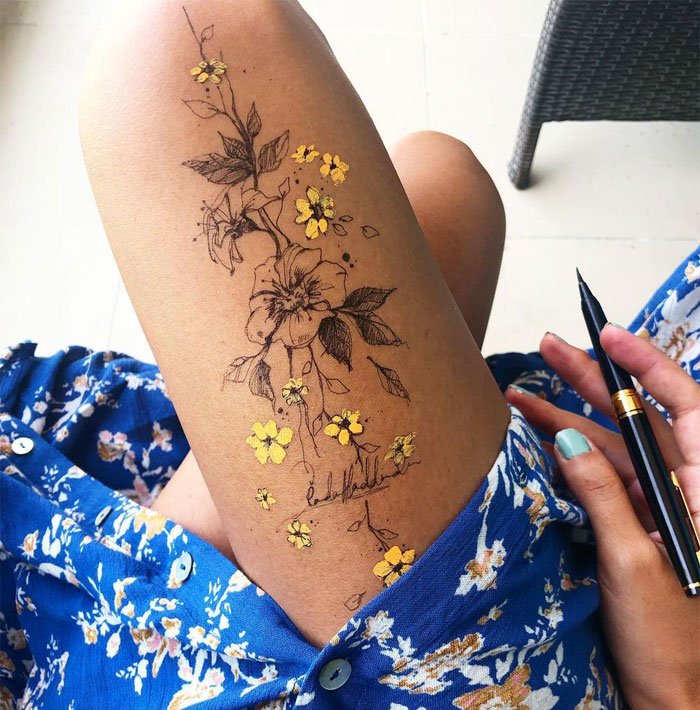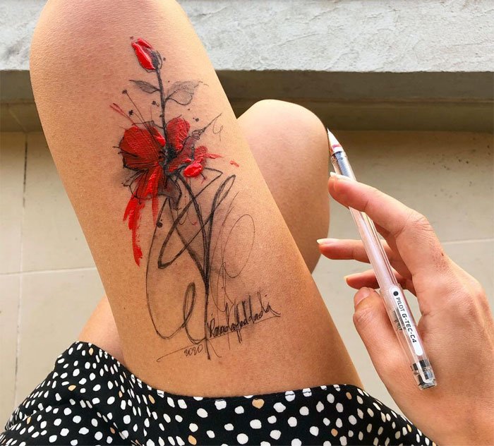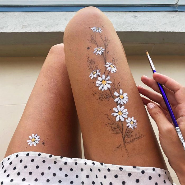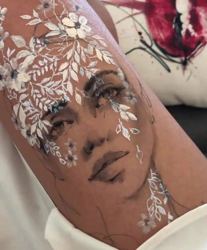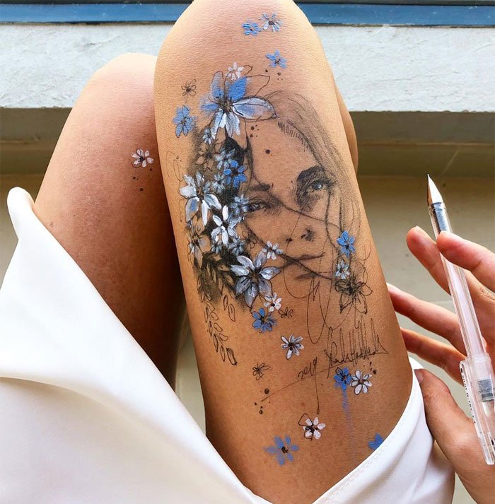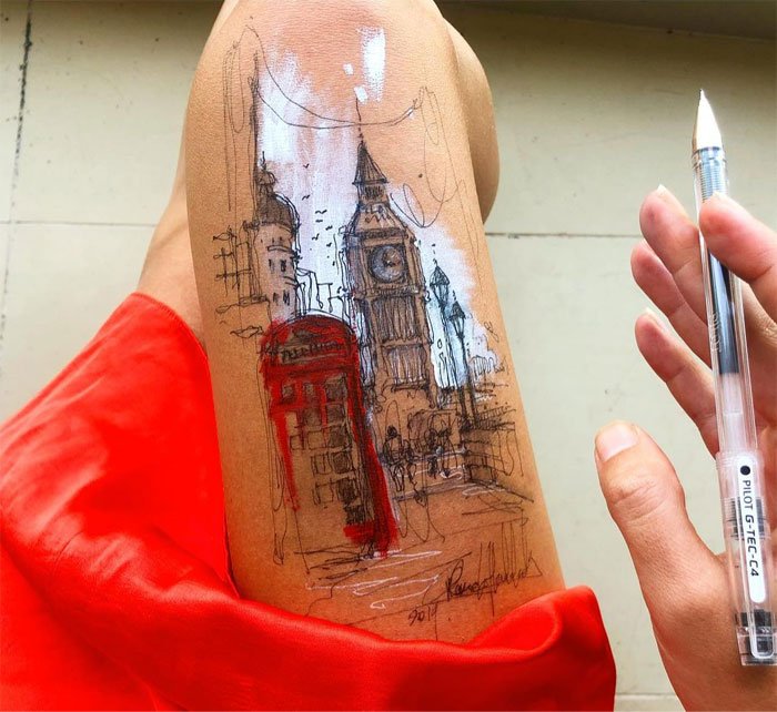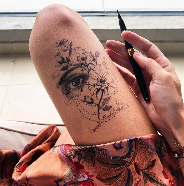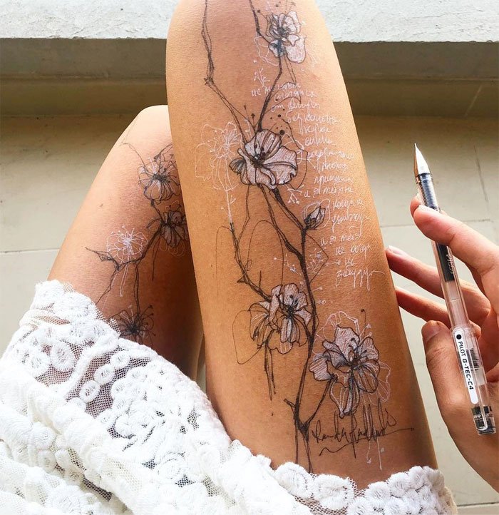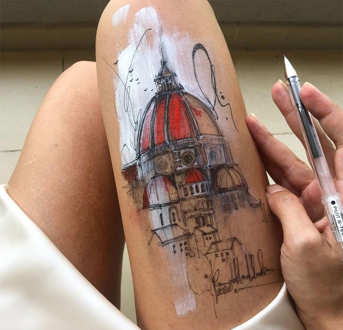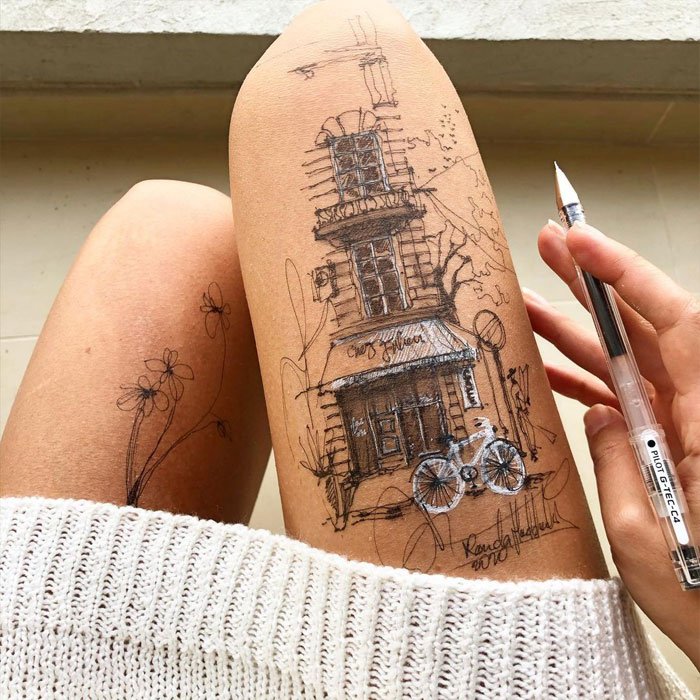 Artystka Randa Haddadin znana jest z zamieszczania w Internecie rysunków, które wykonała na własnych udach. Nie tylko płótno jest na tyle niezwykłe, że od razu nasuwa skojarzenia z Randą, ale również same obrazy są naprawdę wyjątkowe – eleganckie, szczegółowe i przypominające tatuaże, często zawierające motywy kwiatowe lub struktury architektoniczne.