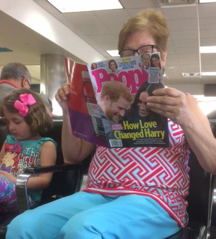 19. Kulisy powstawania tego zdjęcia: syn internautki głośno zapytał swoją mamę, dlaczego ta pani czyta „Magazyn o kupie” („poop” to z ang. „kupa”).