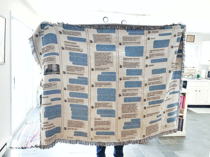 13. Koc z wydrukowaną pierwszą rozmową z Tindera jako prezent na rocznicę.