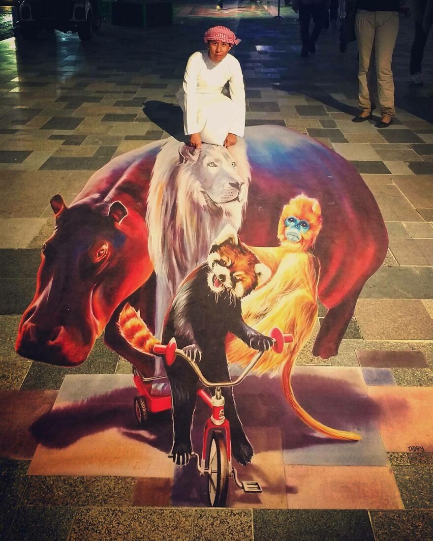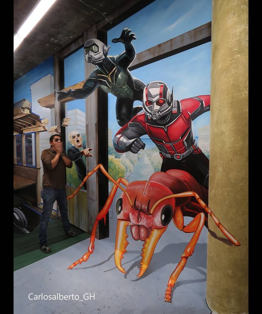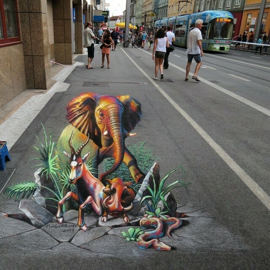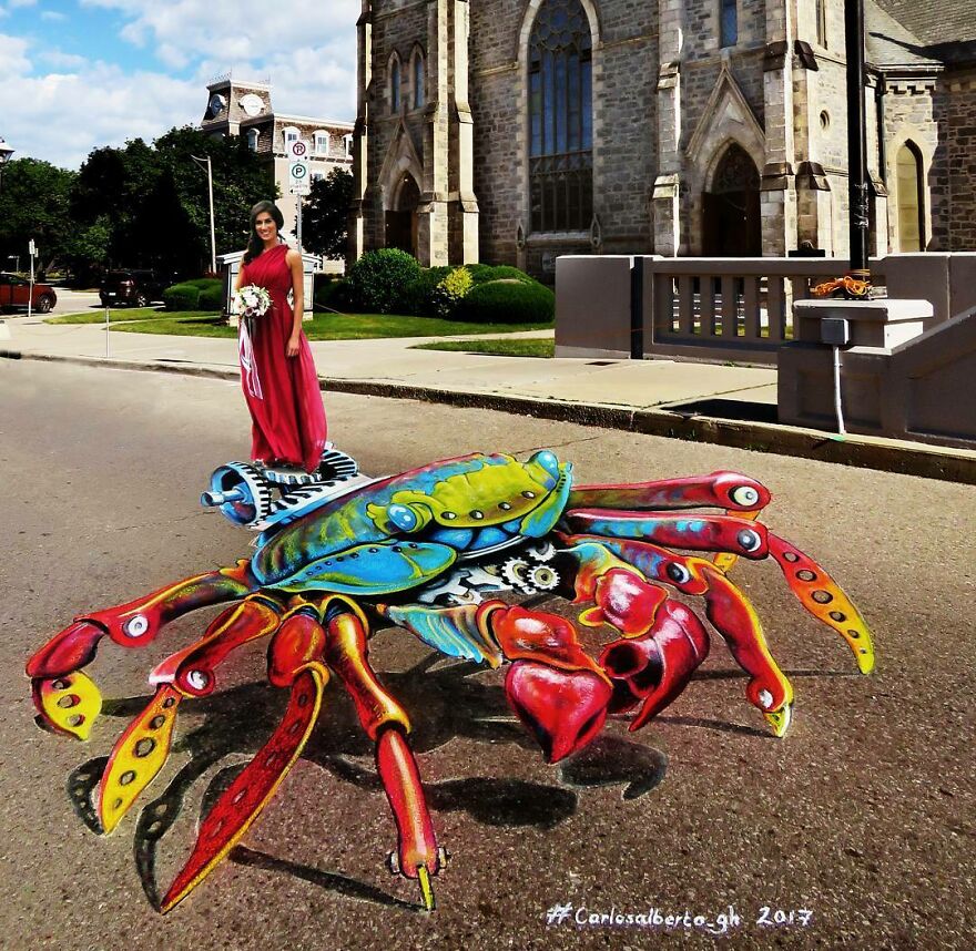Podczas gdy niektórzy domniemani „artyści grafitti” umieszczają swoją wątpliwą sztukę w najmniej odpowiednich miejscach, inni przekształcają przestrzenie miejskie w miejsca rodem z innego świata. Utalentowany 31-letni meksykański artysta Carlos Alberto GH, mieszkający obecnie w Guadalajarze, tworzy niezwykłą anamorficzną sztukę uliczną. Przekształca on nudne przestrzenie w surrealistyczne sceny, które ożywają, gdy patrzy się na nie pod odpowiednim kątem. Wygląda to tak, jakby jego kreacje wyskakiwały z chodnika lub ścian, a najlepsze jest to, że może się wydawać, jakby wchodziło się z nimi w interakcję! Artysta po mistrzowsku bawi się cieniami i perspektywą, tworząc kolorowe, trójwymiarowe złudzenia optyczne, które sprawią, że każdy przechodzień zatrzyma się na chwilę i obróci głowę, próbując sprawdzić, jakim cudem jest to możliwe.