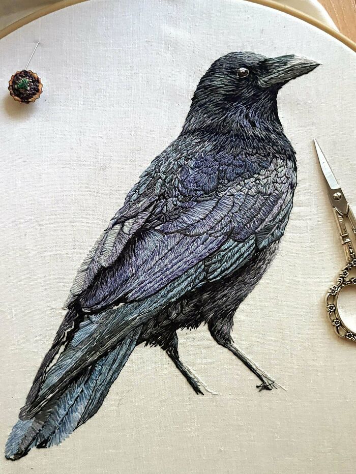 3. „Oto wrona, którą haftowałem przez kilka miesięcy. Muszę jeszcze dodać jej stopy i skałę, na której mogłaby stanąć.”