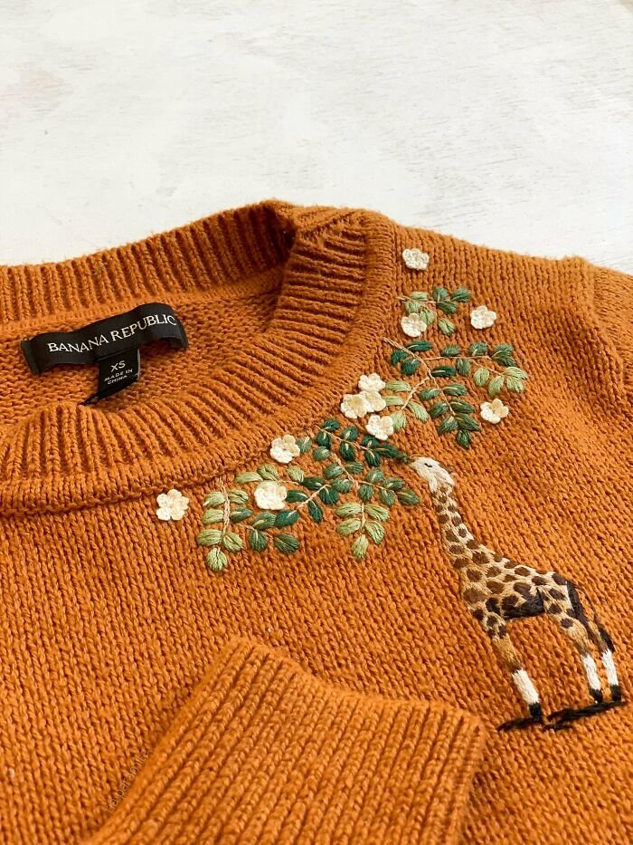 13. „Zrobiłam kilka projektów ręcznego haftu na swetrach dla przyjaciółek, a ten jest moim ulubionym.”