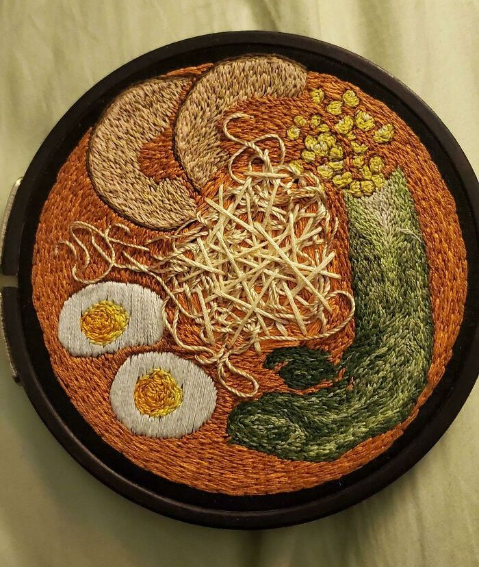 30. „Moja dziewczyna niedawno zmarła, a to była ostatnia rzecz, którą wyhaftowała. To miska ramenu, nasz ulubiony wspólny posiłek.”
