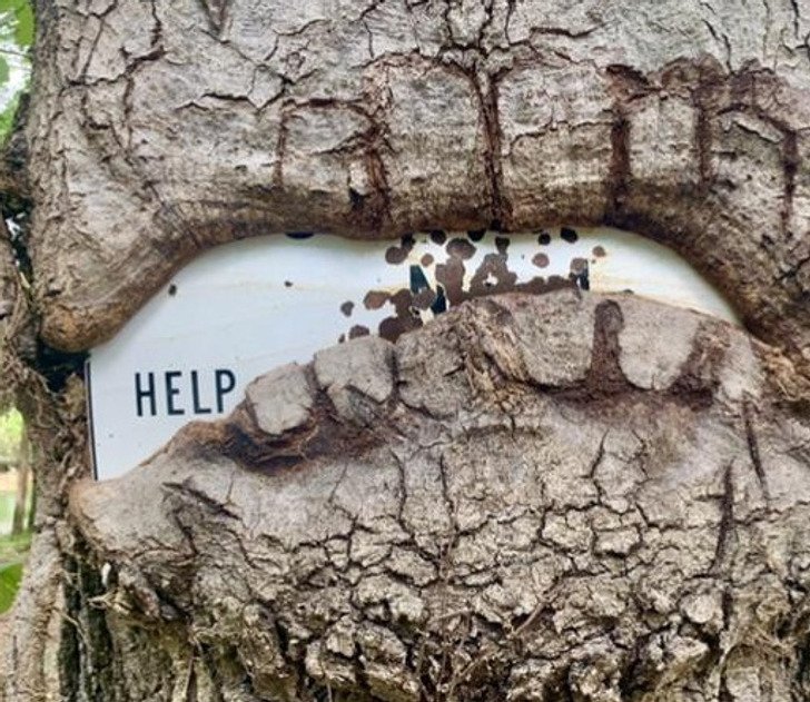 11. Na tym zdjęciu widoczny jest znak, który dosłownie obrosło drzewo.