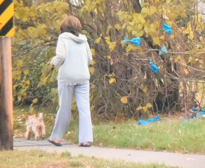 16. Każdego dnia ta pani wyprowadza swojego psa i wyrzuca jego kupę na to samo drzewo.