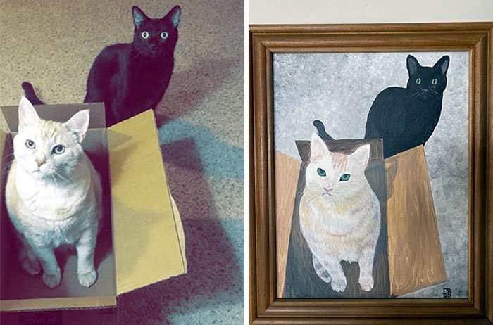 24. „Niedawno dostałem w prezencie ten niesamowity obraz. Moja mama go namalowała, a tata zrobił do niego ramę (prawdziwe zdjęcie po lewej).”