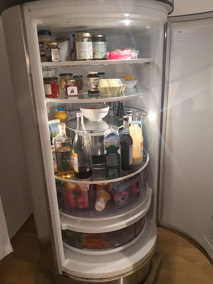 9. Ta lodówka ma obrotowe poziomy, dzięki czemu cała jej zawartość jest łatwo dostępna.